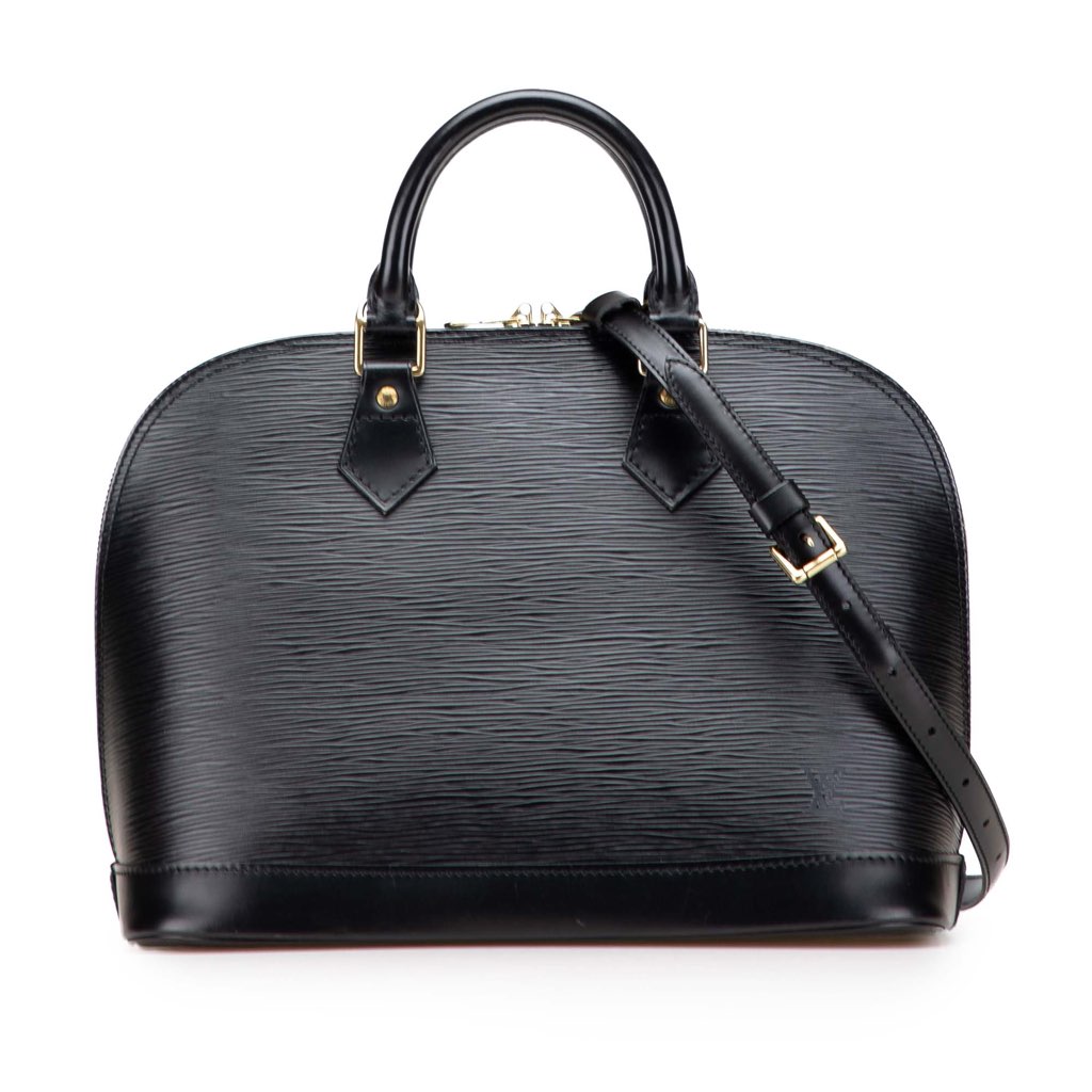 The Epi Alma PM features an epi leather body, rolled handles, a top zip closure and an interior slip pocket.