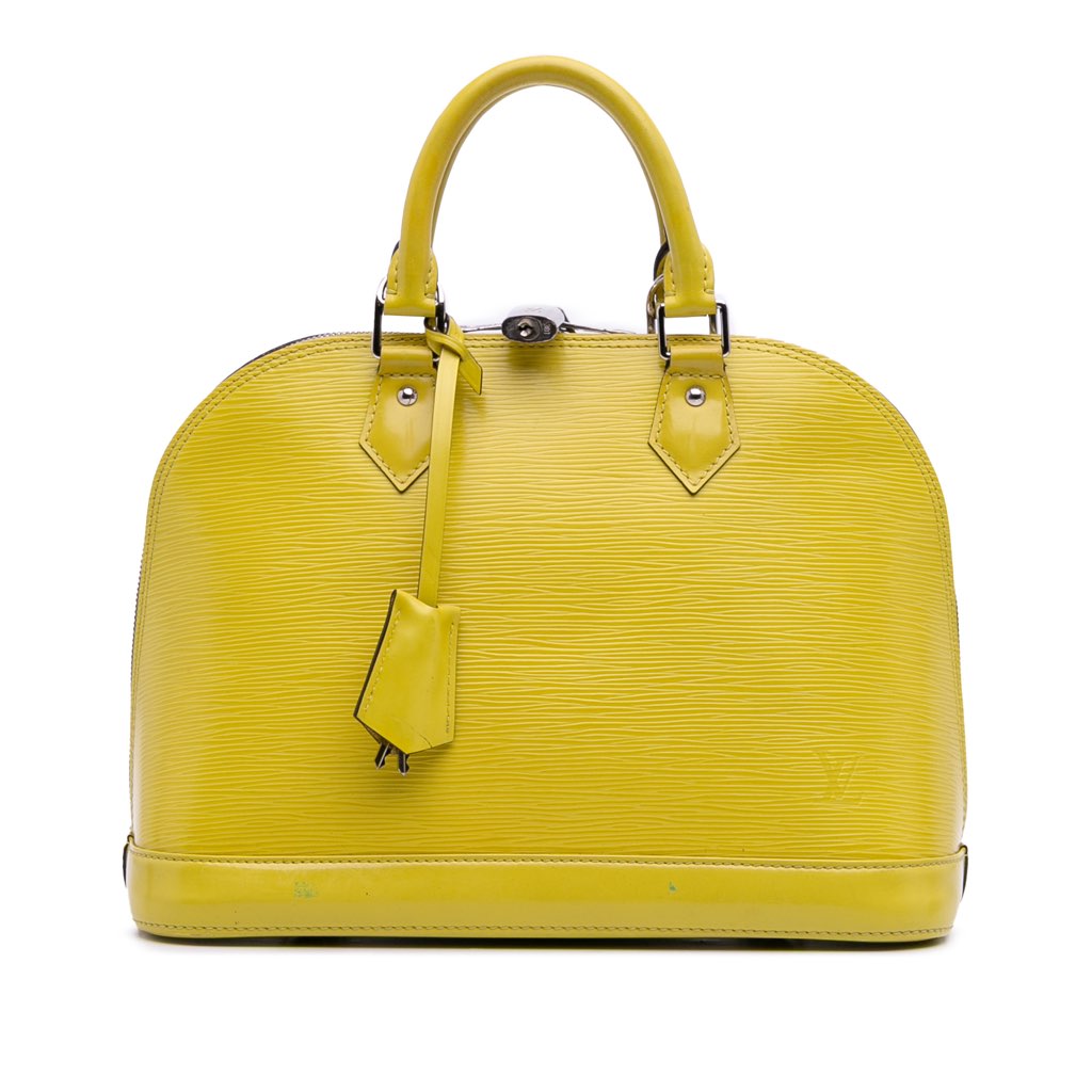 The Alma PM features an epi leather body, rolled handles, a top zip closure, and an interior slip pocket.