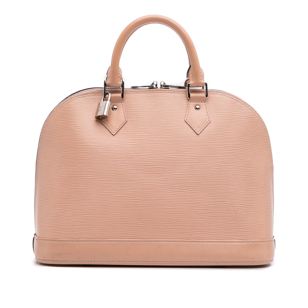 The Alma PM features an epi leather body, rolled handles, a top zip closure, and an interior slip pocket.