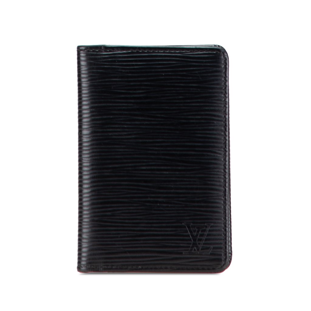 This card holder features an epi leather body, an exterior slip pocket, and interior card slots.