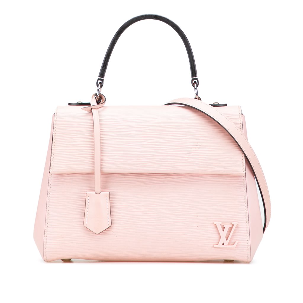 The Cluny features an epi leather body, a flat top handle, a detachable flat strap, a top flap with magnetic closure, and interior zip and slip pockets.