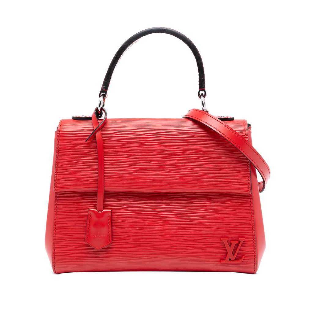 The Cluny BB features an epi leather body, a flat top handle, a detachable flat leather strap, a top flap with magnetic snap closure, and interior zip and slip pockets.