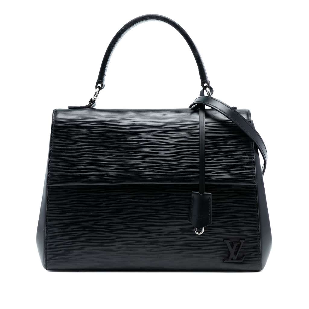 The Cluny MM features an epi leather body, a flat leather top handle, a detachable flat leather shoulder strap, a front flap with magnetic snap closure, and interior zip and slip pockets.