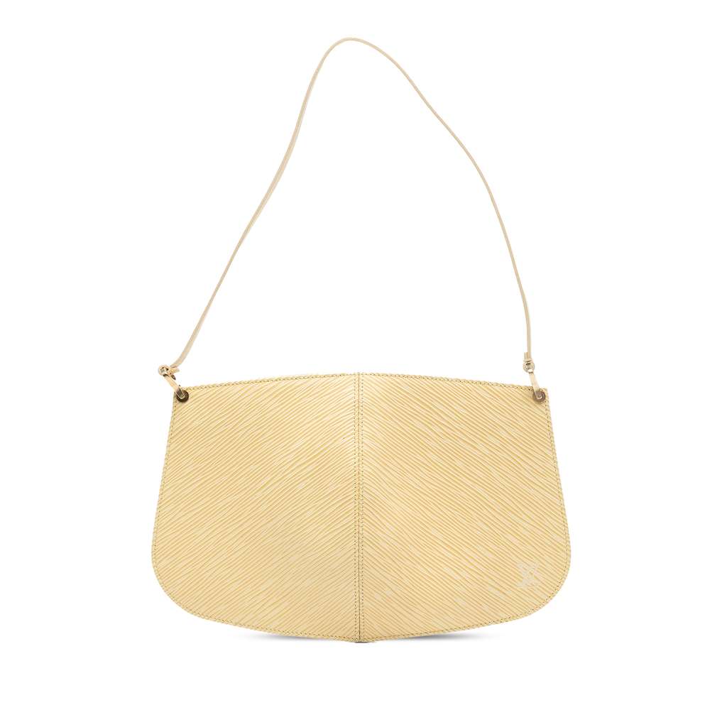 The Demi Lune Pochette features an epi leather body, a flat leather strap, and a top magnetic closure.