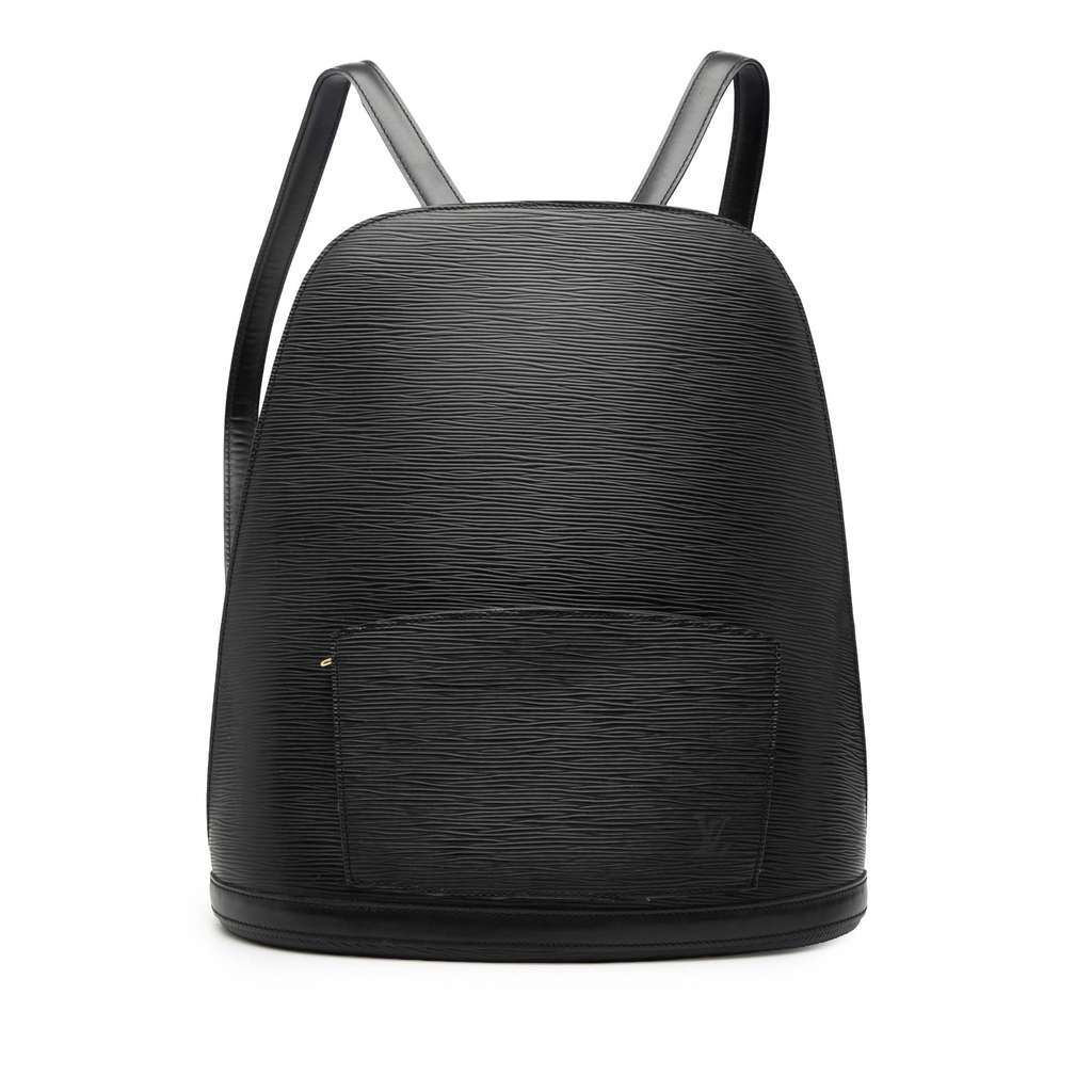 The Gobelins features an Epi leather body, flat leather back straps, a two-way zip around closure, an exterior zip pocket, and an interior slip pocket.