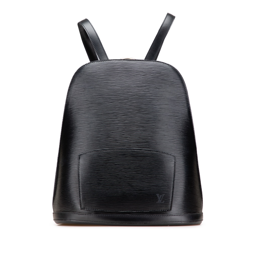 The Gobelins features an epi leather body, flat leather back straps, an exterior zip pocket, a two-way zip around closure, and an interior slip pocket.