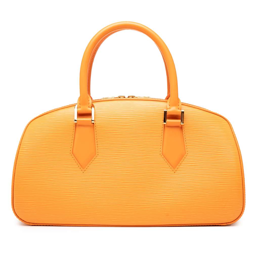 The Jasmine features an epi leather body, rolled leather handles, a top zip closure, and an interior slip pocket.