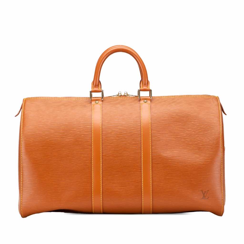 The Keepall 45 features an epi leather body, rolled handles, and a top zip closure.