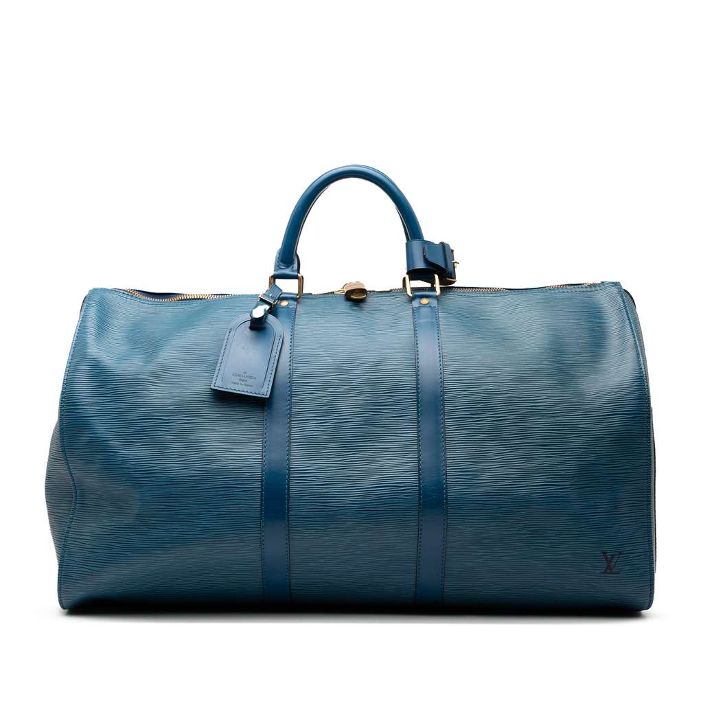 The Keepall 50 features an epi leather body, rolled leather handles, and a top zip closure.