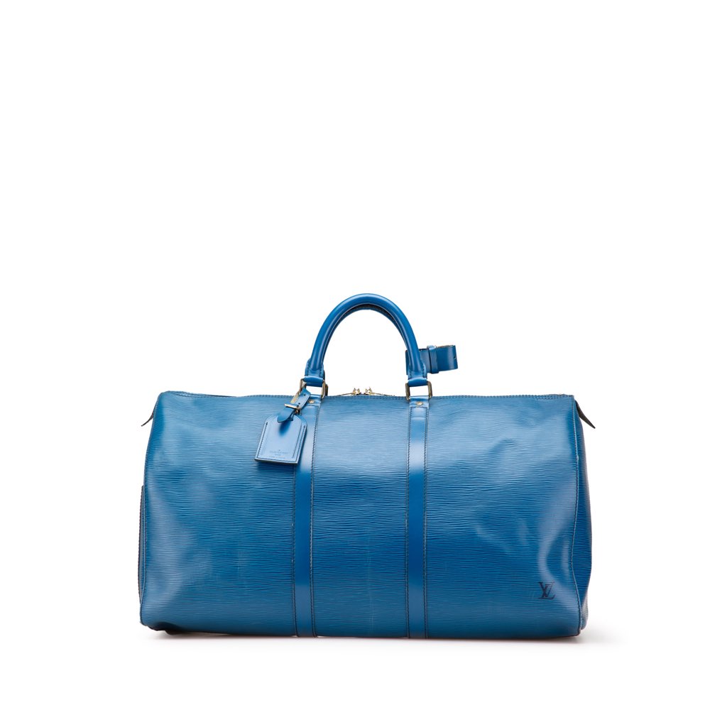The Keepall 50 features an epi leather body, rolled leather handles, and a top zip closure.