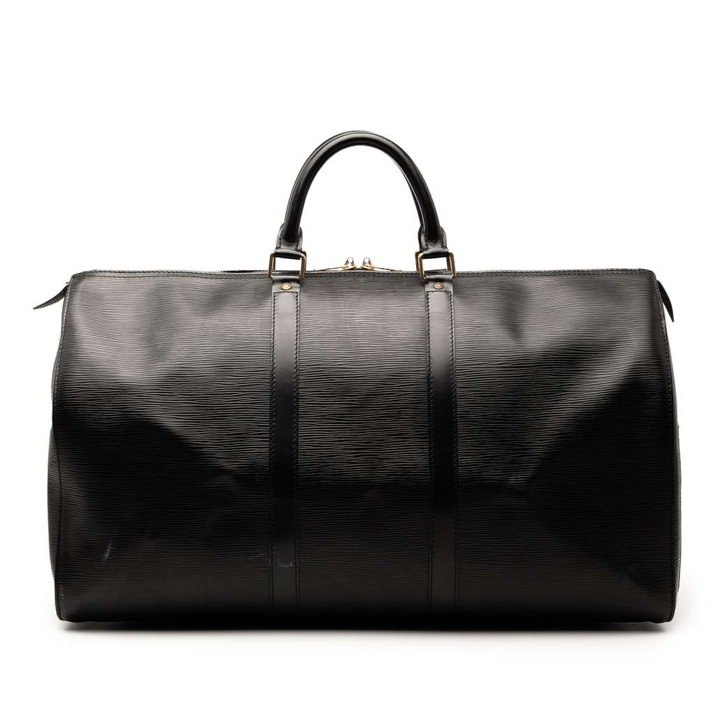The Keepall 50 features an epi leather body, rolled leather handles, a top zip closure, and an exterior side slip pocket.
