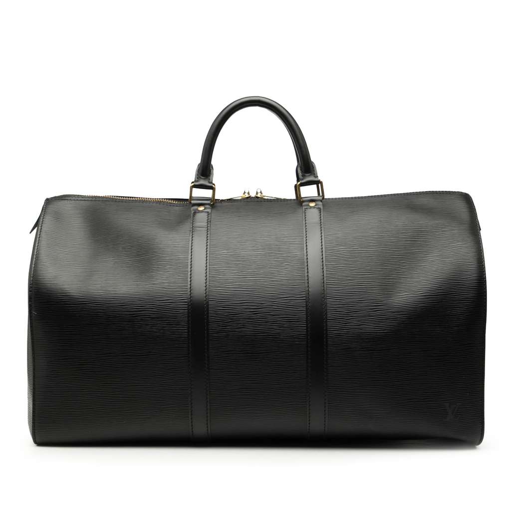The Keepall 50 features an epi leather body, rolled handles, a top zip closure, and an exterior side slip pocket.