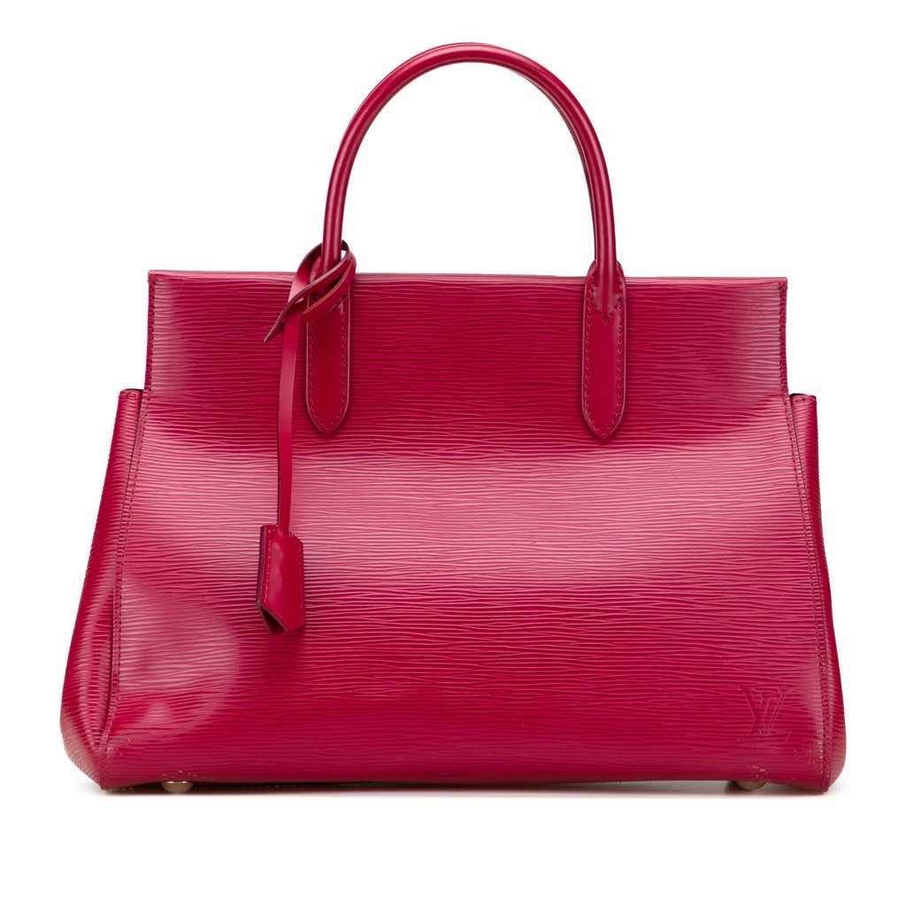 The Marly MM features an epi leather body, rolled leather handles, a detachable flat strap, a top magnetic closure, an interior zip compartment, and interior slip pockets.
