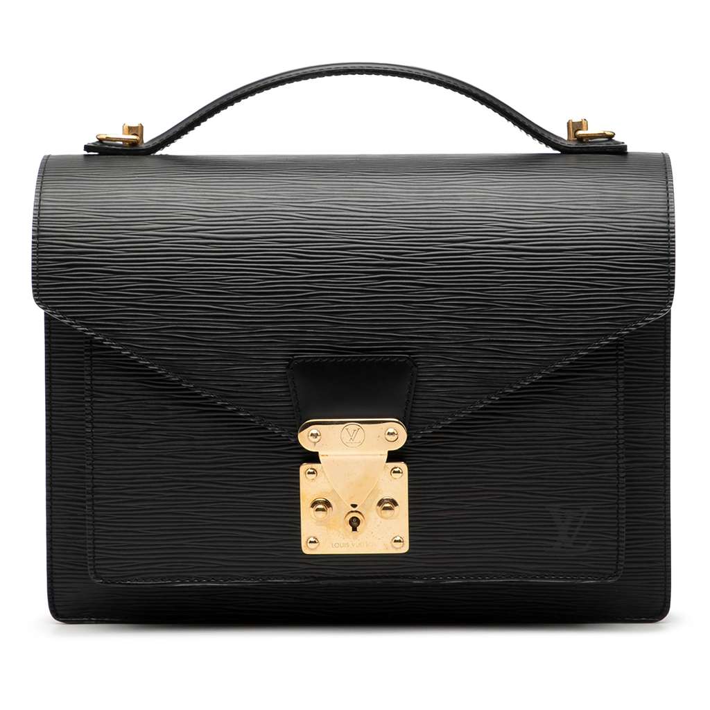 The Monceau features an epi leather body, a flat leather top handle, a front flap with push lock closure, an exterior front flap pocket, and an interior zip pocket.