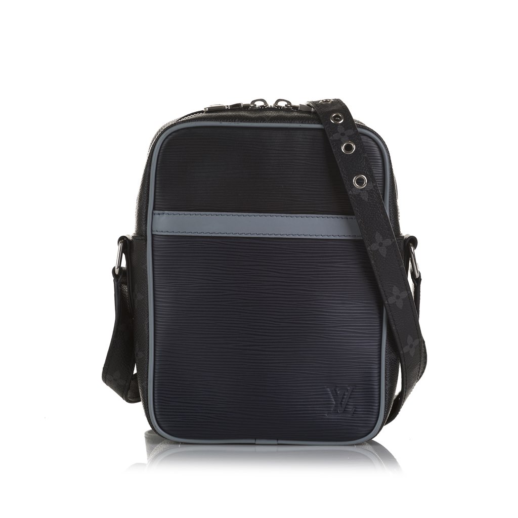 The Danube features an epi leather body with monogram canvas trim, an exterior front slip pocket, an adjustable shoulder strap, and a top zip closure.