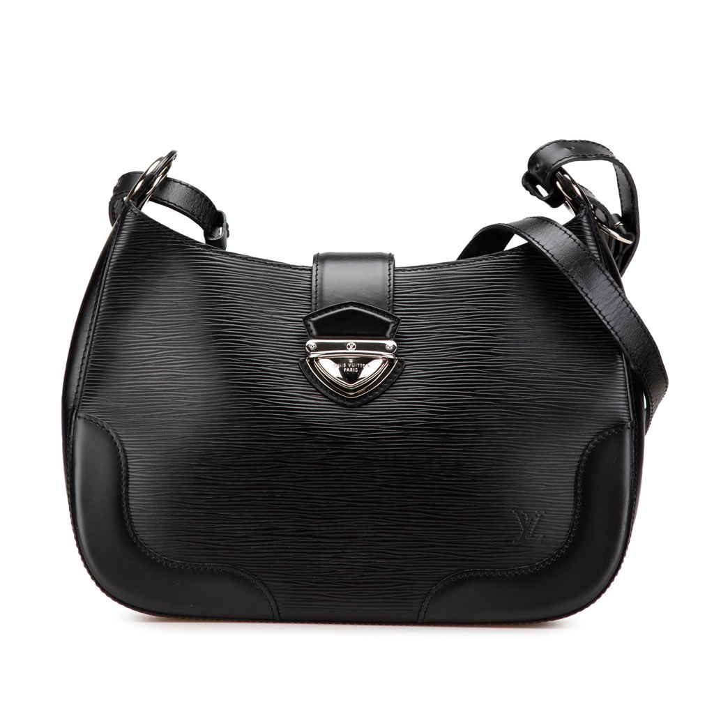 The Musette Bagatelle features an epi leather body, an adjustable flat leather strap, an open top with a strap and push lock closure, and an interior zip pocket. There is an additional hole in the shoulder strap.