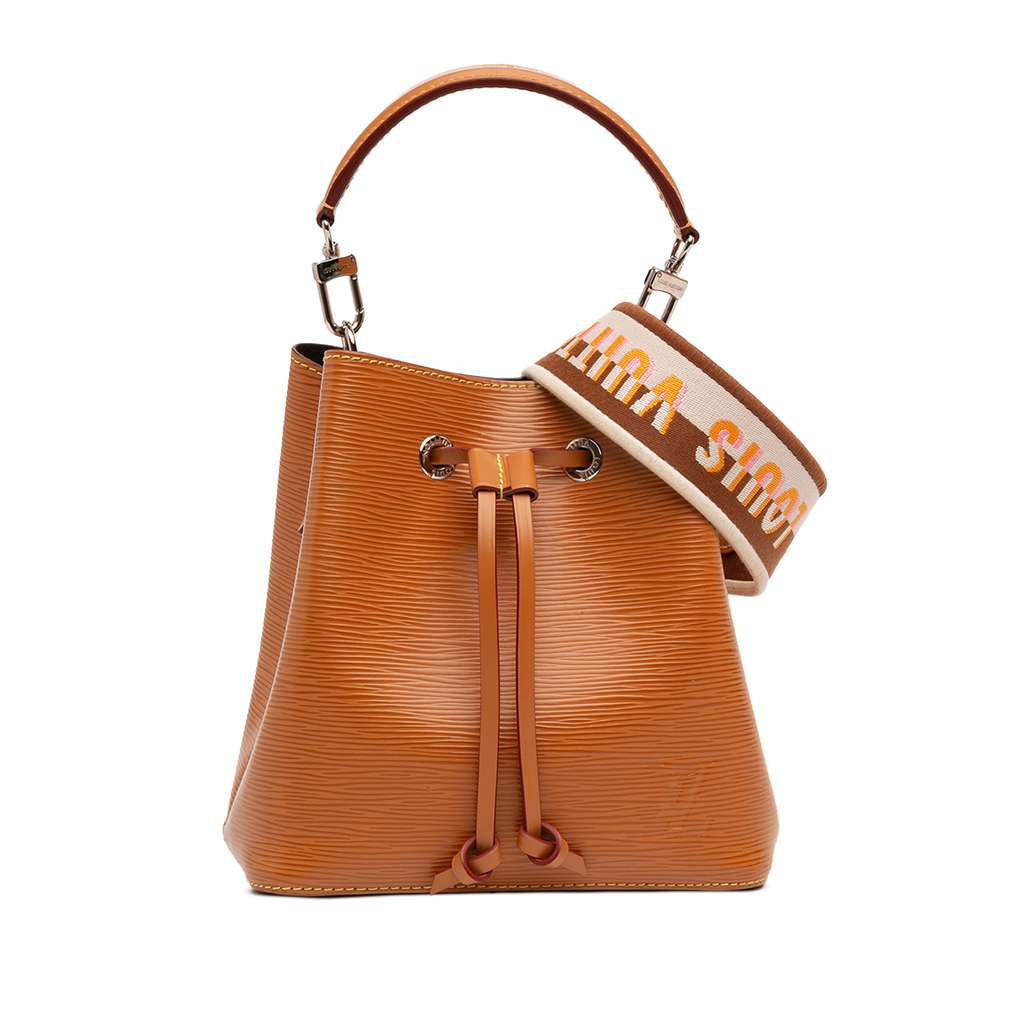 The NeoNoe BB features an epi leather body, a flat leather handle, a detachable flat leather strap, an open top with a drawstring closure, and an interior central compartment with snap closure.
