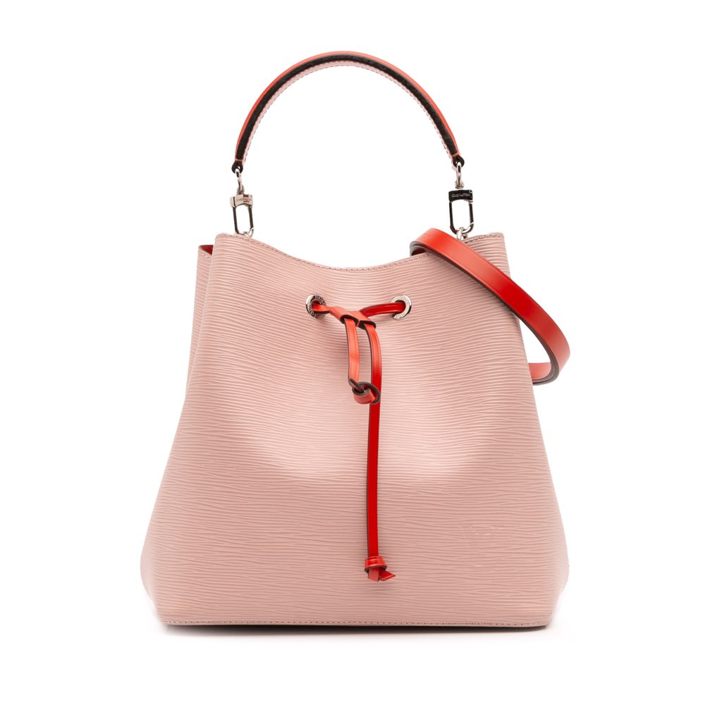 The Neonoe MM features an epi leather body, a flat leather handle, a detachable flat leather strap, a drawstring closure, and an interior zip pocket.