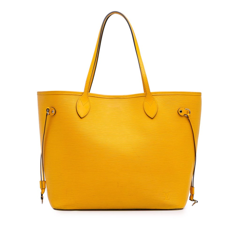 The Neverfull MM features an epi leather body, flat leather straps, and an open top with a lobster clasp closure.