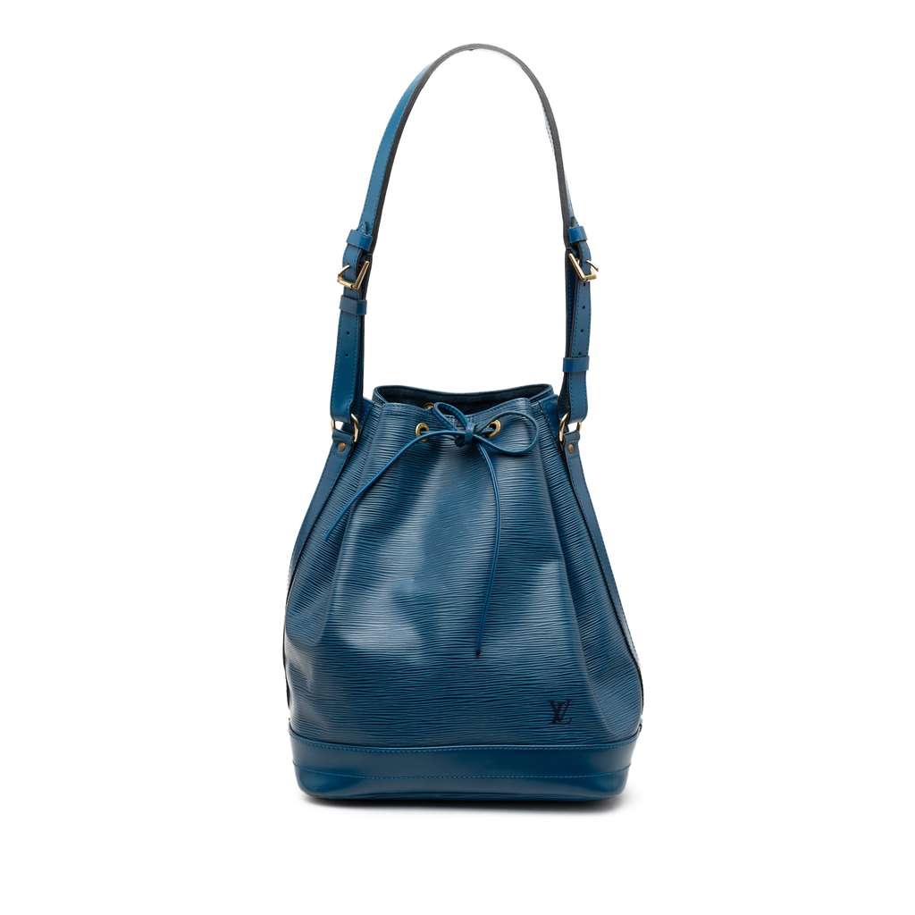 The Noe features an epi leather body, an adjustable flat shoulder strap, and a drawstring closure.