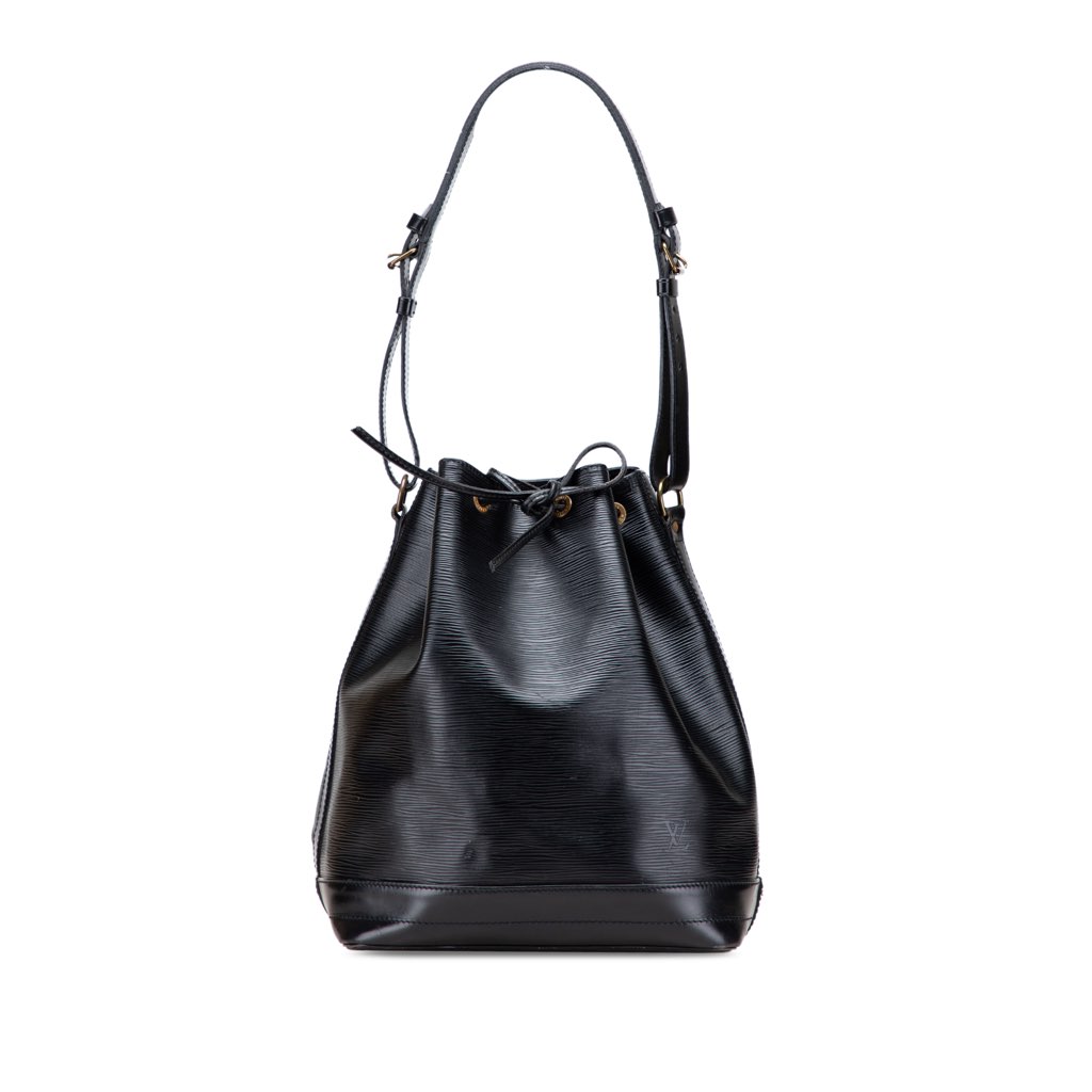 The Noe GM features an epi leather body, an adjustable leather shoulder strap, an open top with a drawstring closure, and an interior zip pocket.