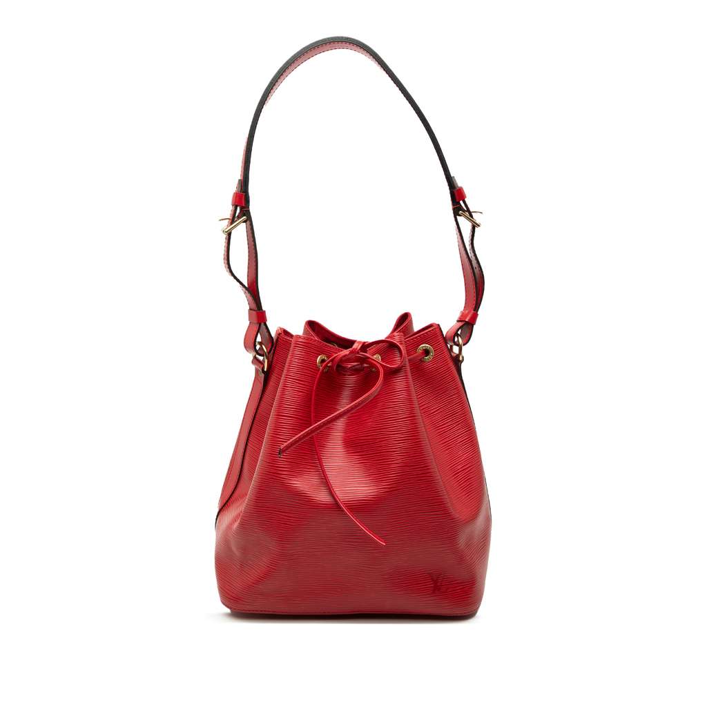 The Petit Noe features an epi leather body, a detachable and adjustable flat leather shoulder strap, and an open top with drawstring closure.