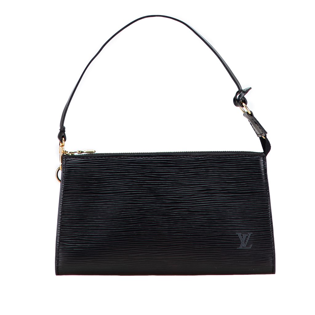 The Pochette Accessoires features an epi leather body, a detachable flat leather shoulder strap, and a top zip closure.