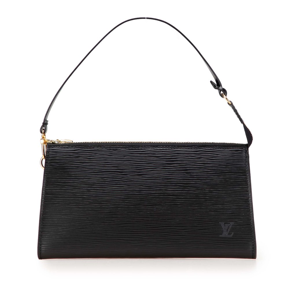 The Pochette Accessoires features an epi leather body, a detachable flat shoulder strap, and a top zip closure.