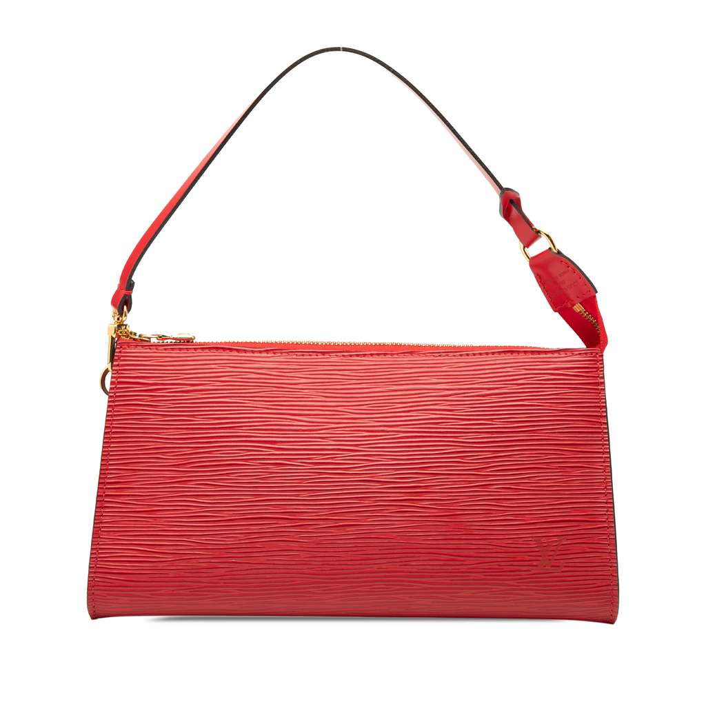 The Pochette Accessoires features an epi leather body, a flat leather shoulder strap, and a top zip closure.