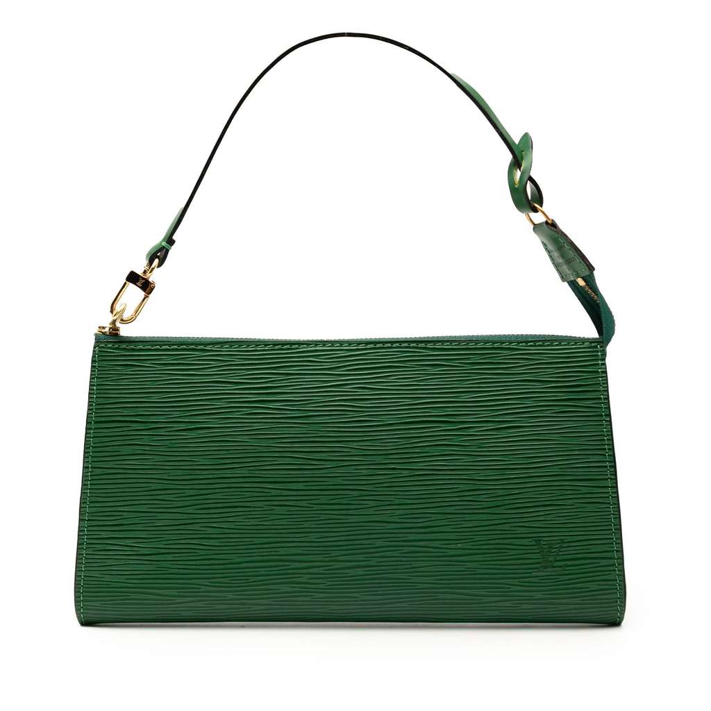 The Pochette Accessoires features an epi leather body, a flat shoulder strap, and a top zip closure.