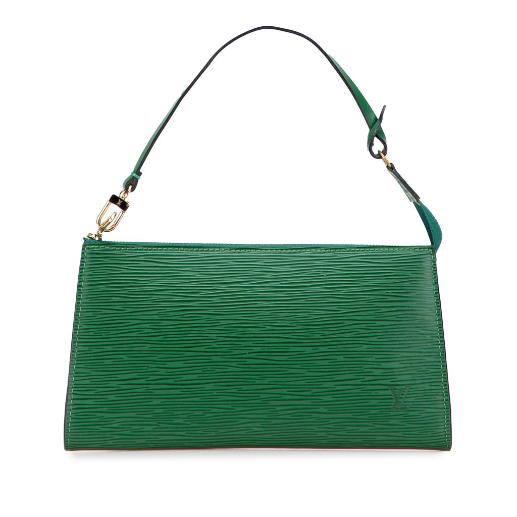 The Pochette Accessoires features an epi leather body, a flat shoulder strap, and a top zip closure.