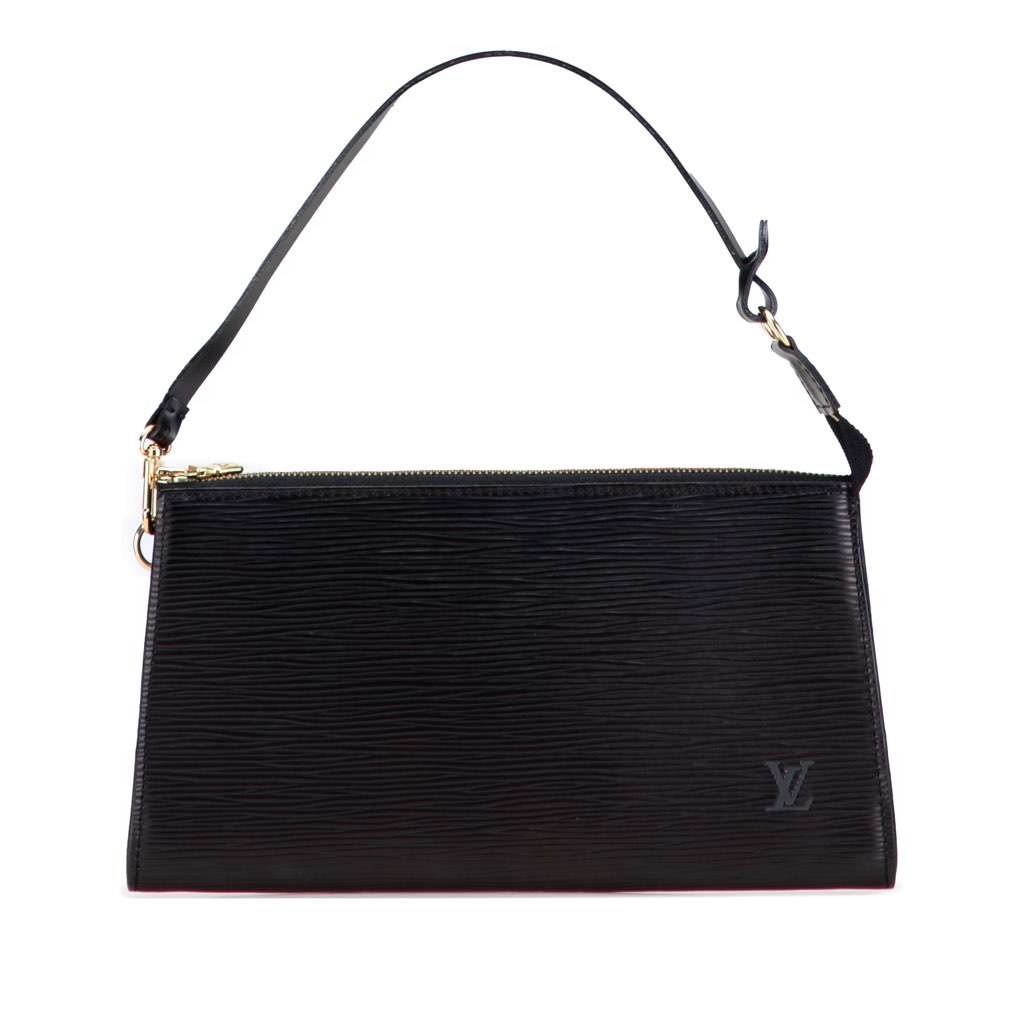 The Pochette Accessoires features an epi leather body, a detachable flat shoulder strap, and a top zip closure.