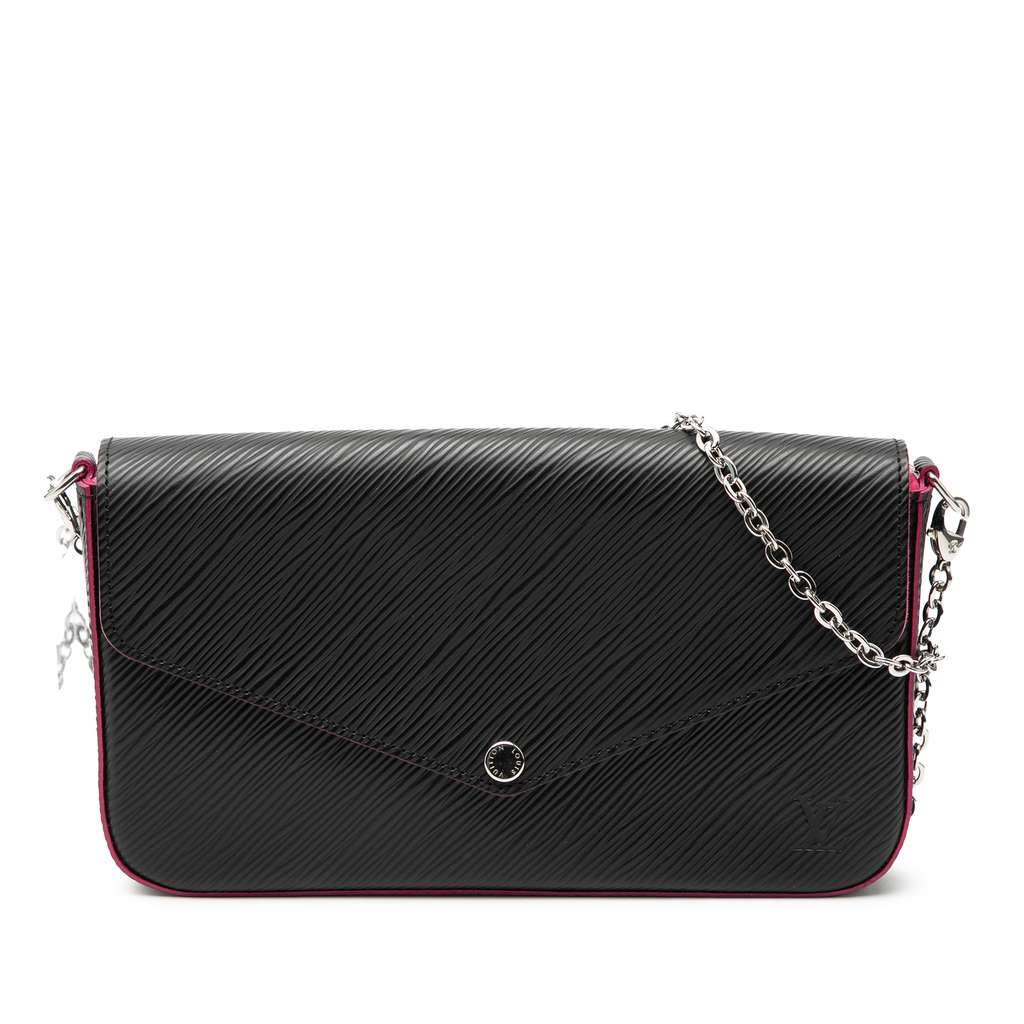 The Pochette Felicie features an epi leather body, a detachable chain strap, a front flap with snap fastener closure, and an interior slip pocket.