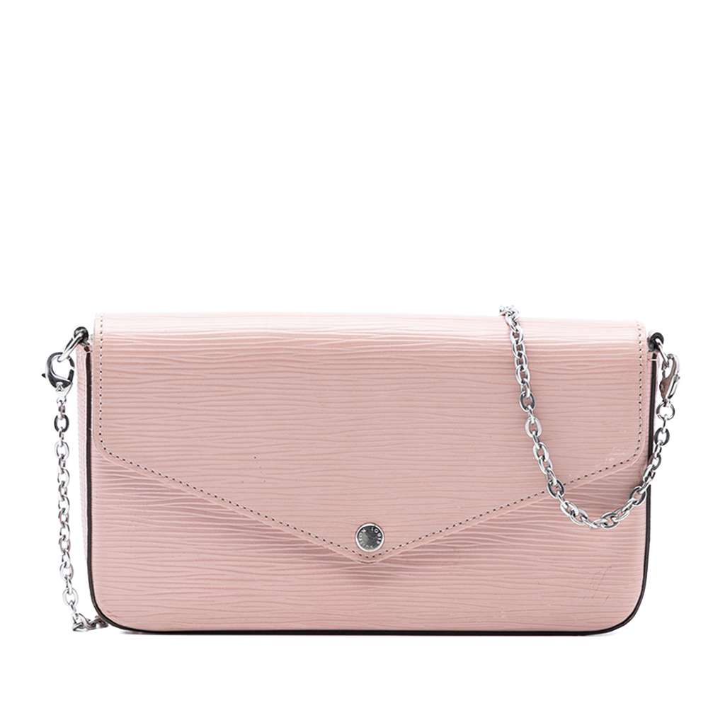 The Pochette Felicie features an epi leather body, a detachable chain strap, a flap with snap button closure, an interior slip pocket, and a detachable zip pouch.