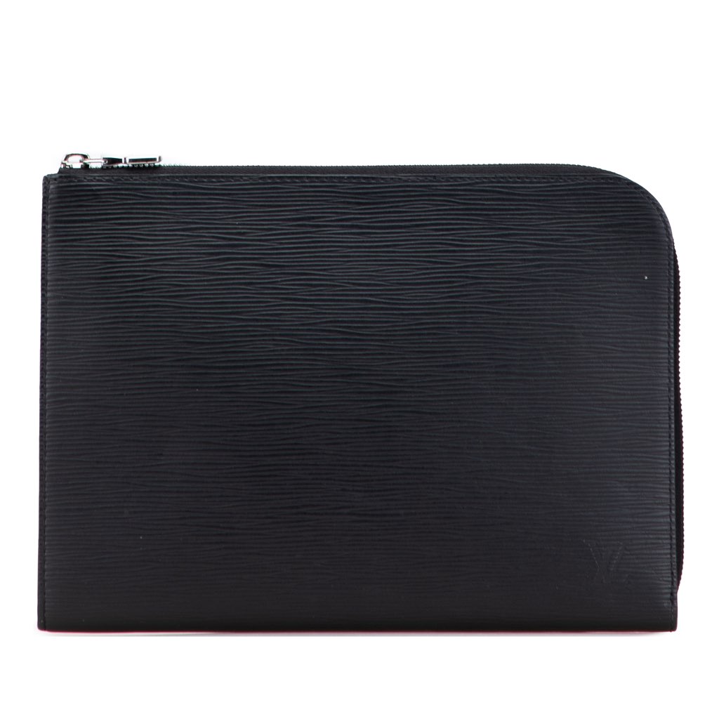 The Pochette Jour features an epi leather body, a zip-around closure, and interior slip pockets.
