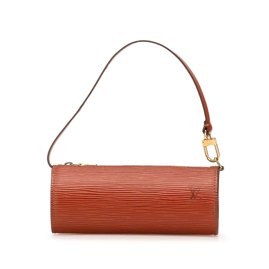 The Pochette Papillon features an epi leather body, a detachable flat leather strap, and a top zip closure.
