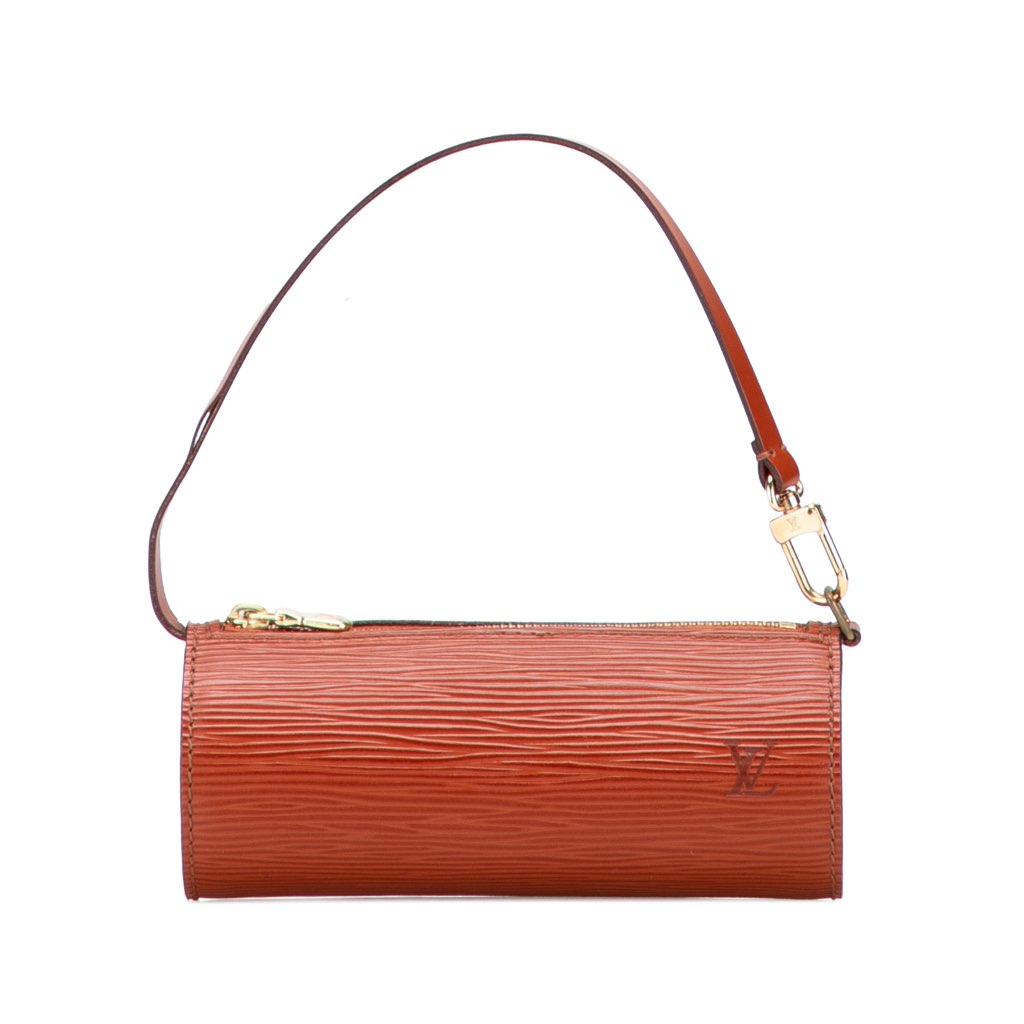 The Pochette Papillon features an epi leather body, a detachable flat leather strap, and a top zip closure.