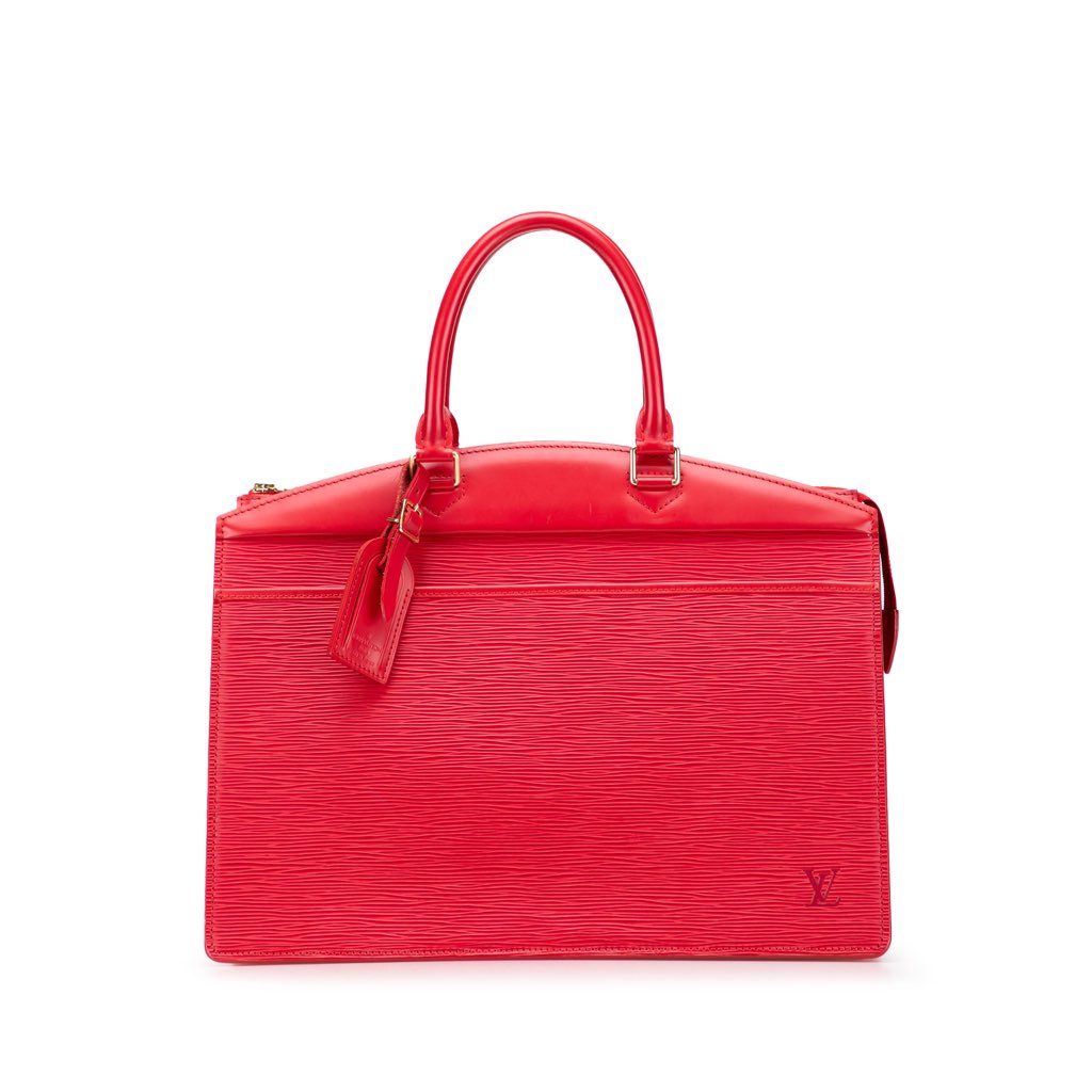 The Riviera features an epi leather body, rolled handles, a top zip closure, an exterior slip pocket, and interior slip pockets.