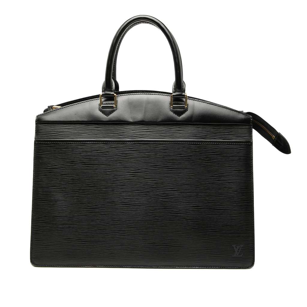 The Riviera features an epi leather body, rolled leather handles, a top zip closure, an exterior slip pocket, and interior slip pockets.