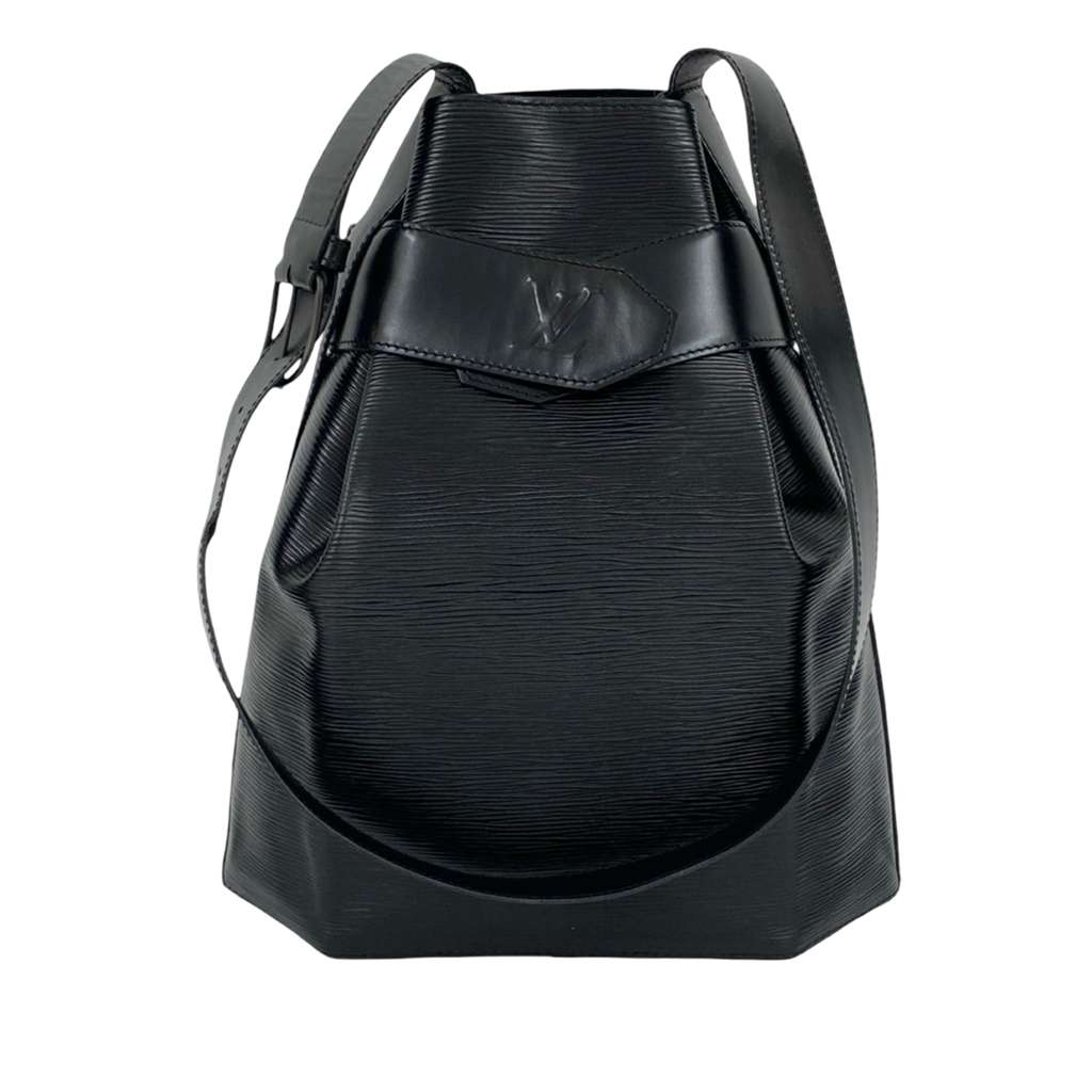 The Sac D'Epaule features epi leather body, an adjustable flat strap, and an open top with a snap closure at the front.