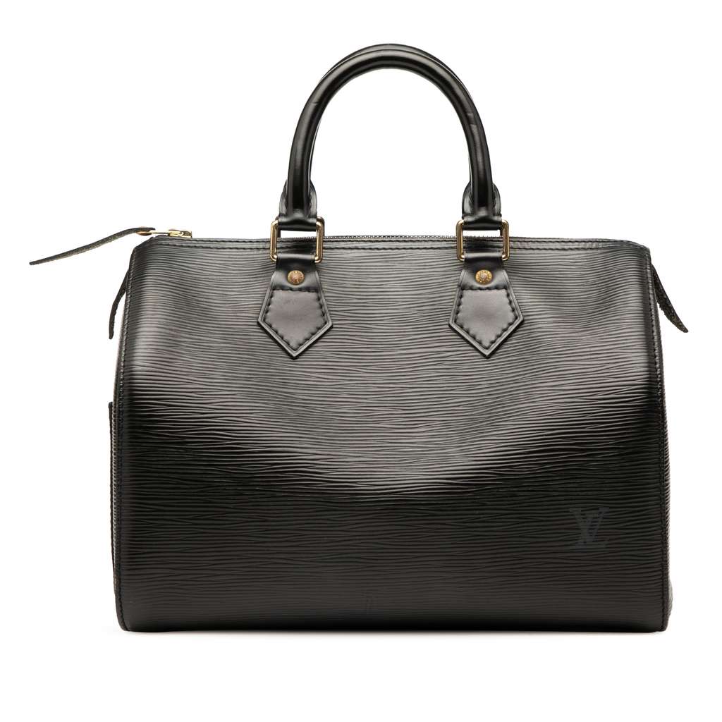 The Speedy 25 features an epi leather body, an exterior side slip pocket, rolled leather handles, a top zip closure, and an interior slip pocket.