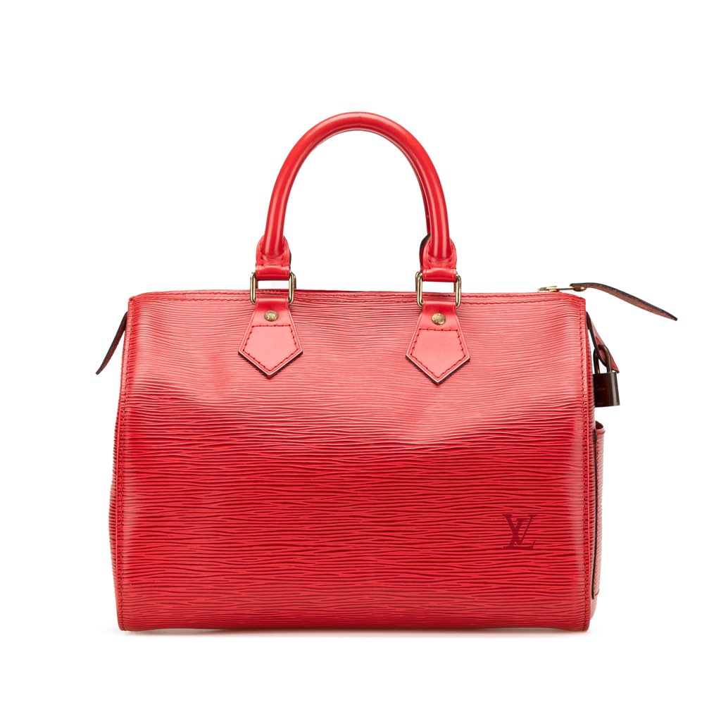 The Speedy 25 features an epi leather body, rolled leather handles, a top zip closure, an exterior side slip pocket, and an interior slip pocket.