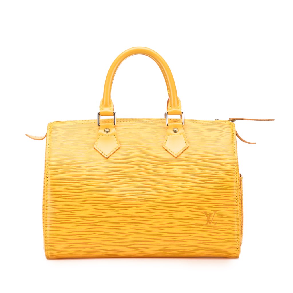 The Speedy 25 features an epi leather body, rolled leather handles, a top zip closure, and an interior pocket.