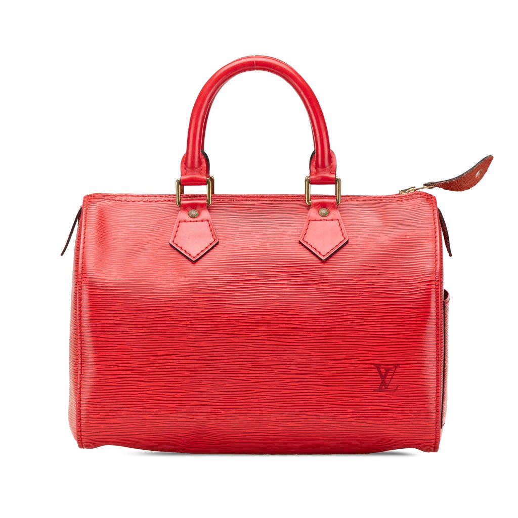 The Speedy 25 features an epi leather body, rolled handles, a top zip closure, an exterior side slip pocket, and an interior slip pocket.