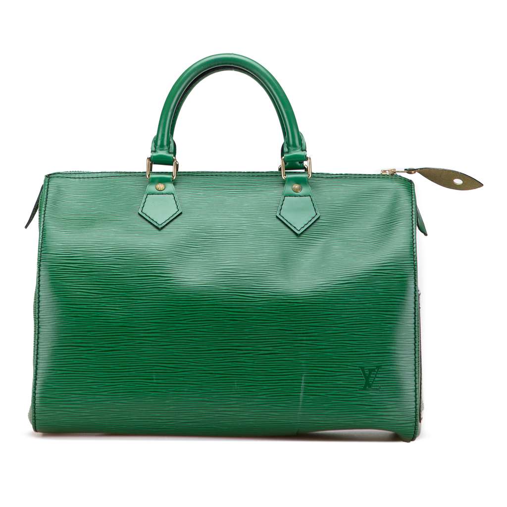 The Epi Speedy 30 features an Epi leather body, rolled leather top handles, a top zip closure, an exterior side slip pocket, and an interior pocket.