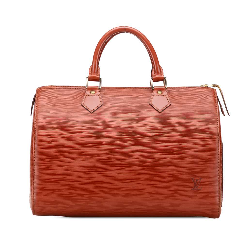The Speedy 30 features an epi leather body, rolled handles, a top zip closure, an exterior side slip pocket, and an interior slip pocket.
