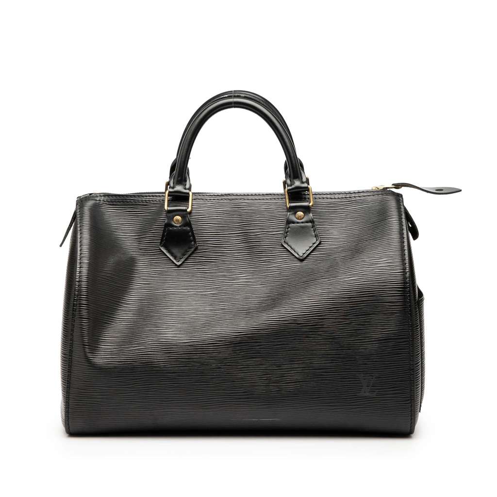 The Speedy 30 features an epi leather body, rolled handles, a top zip closure, and an interior slip pocket.