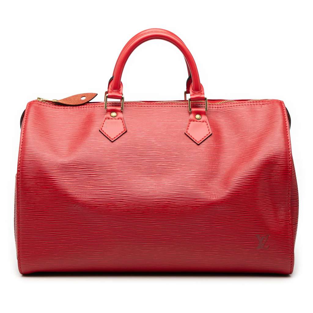 The Speedy 35 features an epi leather body, rolled handles, a top zip closure, an exterior side slip pocket, and an interior slip pocket.