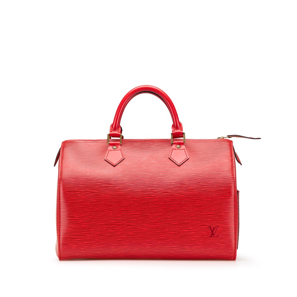 The Speedy 35 features an epi leather body, rolled leather handles, a top zip closure, and an interior pocket.