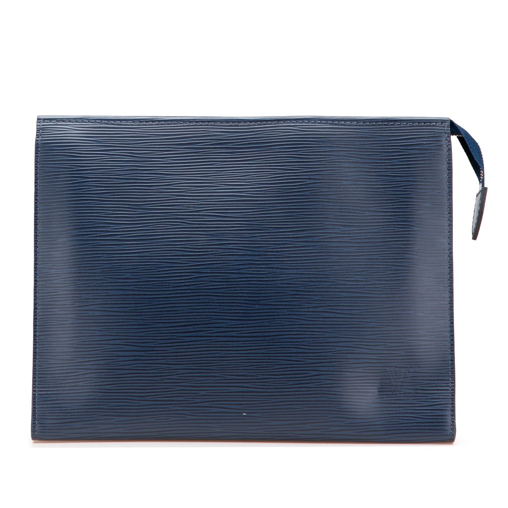 The Epi Toiletry Pouch 26 features an epi leather body, a top zip closure, and an interior slip pocket.